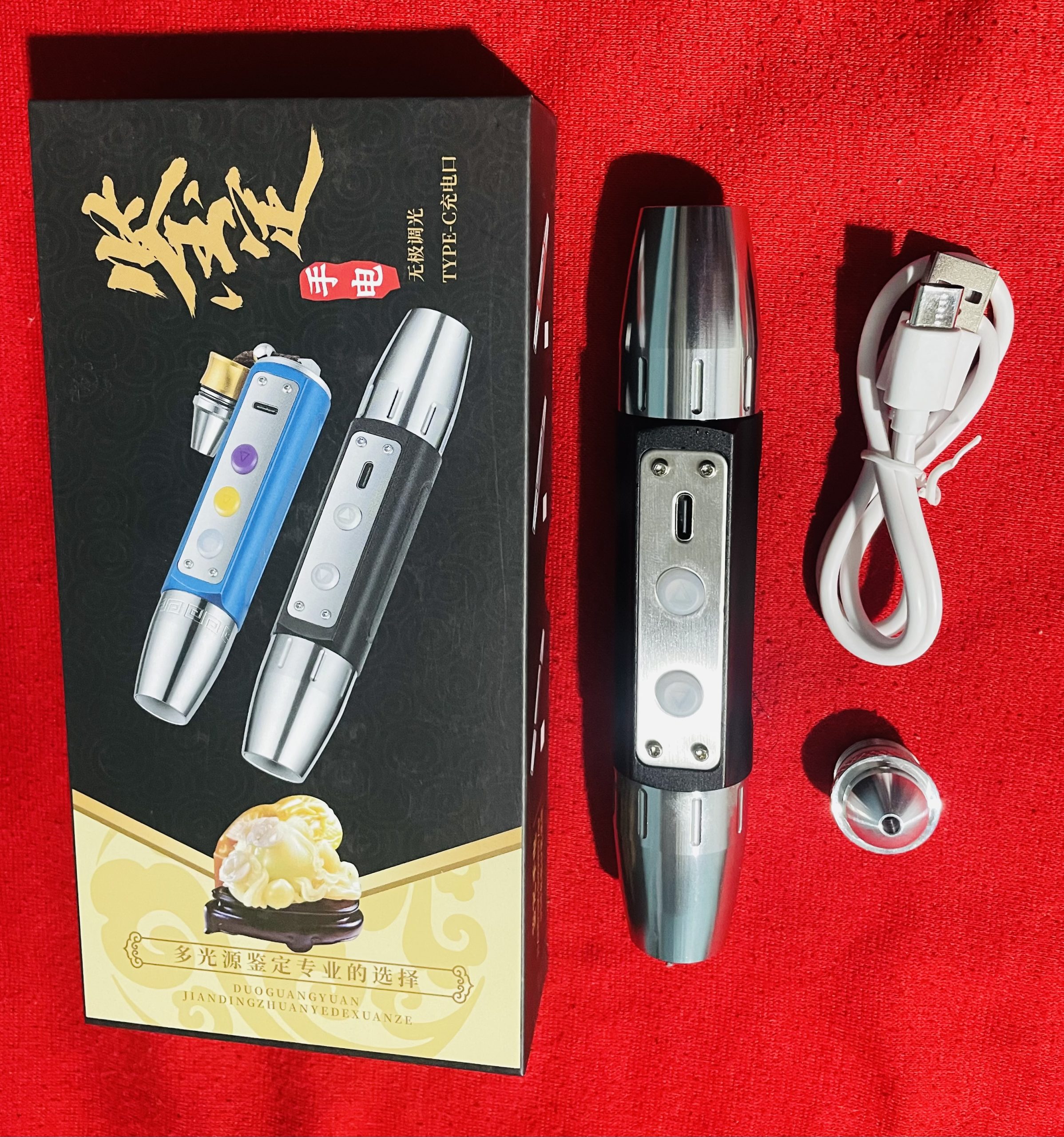 This USB rechargeable 4-light source gem torch is designed for professional gemstone inspection and fluorescence testing. The torch includes White, Yellow, UV 365 nm and UV 395 nm light modes, allowing accurate observation of gemstone color, inclusions and fluorescent reactions.